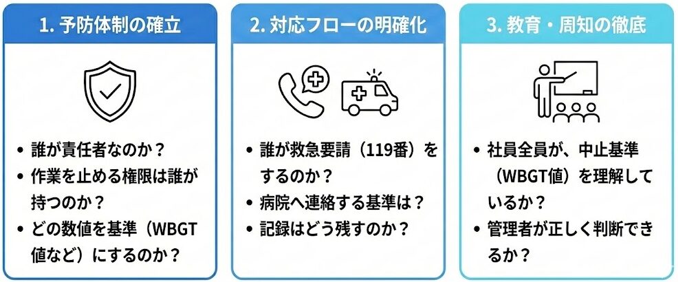 1. 熱中症を「予防する体制」の確立 単にエアコンを入れるだけでは体制とは認められません。