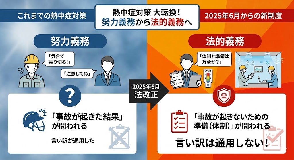 これまでの熱中症対策は「気をつけていれば良い(努力義務)」ものでした。しかし、2025年6月の方針転換により、これは明確な「法的義務」となります。 変化のポイントは一つ。「事故が起きたかどうか」ではなく、「事故が起きないための準備(体制)があったか」が問われるようになることです。 「知らなかった」「忙しかった」という言い訳が通用しなくなる新制度について、企業が準備すべきポイントを解説します。