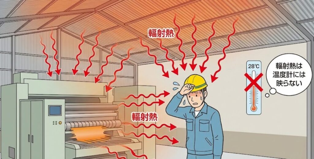 - 輻射熱とは: 太陽の直射日光や、熱せられた屋根・壁、高温の機械から電磁波として直接体に伝わる熱のこと。